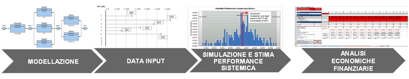 Tale modello è poi usato come base per implementare la simulazione (con la tecnica Monte Carlo) al fine di generare una storia virtuale del comportamento del sistema nel suo ciclo di vita e valutarne le prestazioni per diverse configurazioni progettuali/scenari di gestione (a livello aggregato di sistema oltre che a livello di sotto-sistemi e componenti singoli).