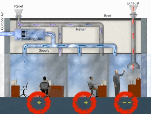 La schematizzazione in figura 1 mostra alcuni vantaggi che un buon impianto di climatizzazione/ventilazione può apportare agli ambienti di lavoro. Ovviamente l'impianto immette aria nei vari ambienti e l'unità di trattamento aria garantisce la filtrazione degli inquinanti interni (l'aria viene parzialmente ricircolata) e gli inquinanti esterni (aria di rinnovo che viene presa dall'esterno). I locali "puliti" (gli uffici) sono posti in pressione rispetto all'ambiente produttivo in quanto lo stesso è posto in depressione grazie ad estrattore che convogli gli inquinanti localizzati verso l'esterno.