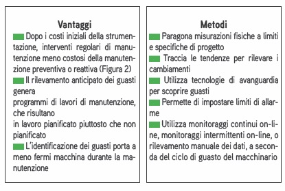 PdM e CBM sono sinonimi. Un programma di CBM valuta la condizione della macchina attraverso la strumentazione, in maniera periodica o continua, al fine di determinarne la condizione, normalmente attraverso un programma di CM. Permette ai planners di settare e programmare la manutenzione secondo il miglior trade off per i costi di manutenzione e prevenzione dei guasti funzionali. I programmi di CBM sono stati spesso definiti programmi di "monitoraggio delle vibrazioni". Ma mentre il monitoraggio delle vibrazioni è un aspetto critico di molti programmi CBM, esistono tuttavia oltre 75 tipi di tecnologie CBM non intrusive. Curve di guasto degli assets, ciclo di guasto e criticità determinano quali tecnologie usare e con che frequenza sarà necessario raccogliere ed analizzare i dati. L'obiettivo della PdM è utilizzare tecnologie di CBM per rilevare i potenziali fallimenti attraverso l'analisi dei segnali di avvertimento. Un solido programma di PdM presenta molti vantaggi rispetto alle altre strategie di manutenzione (vedere la Tabella 1). Una volta messo in atto un solido programma di PdM per una macchina, i programmi di PM possono essere rivisti e in molti casi ottimizzati o eliminati.