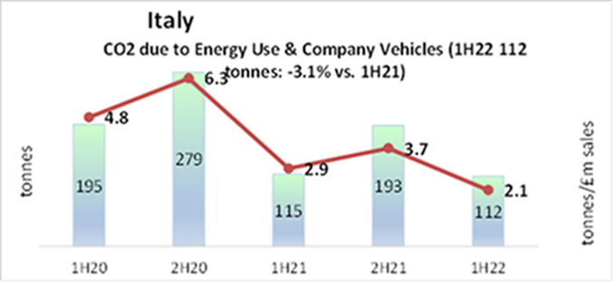 Infine, a settembre, sempre la sede di Sesto San Giovanni ha ottenuto il virtuoso riconoscimento CRP dall’italiana Sfridoo, attiva nel campo dell’economia circolare, per la gestione responsabile e la sensibile riduzione dell’uso degli articoli in plastica. L’impegno così promosso ha dato i suoi frutti: in linea generale, le emissioni di CO2 in atmosfera di RS Italia sono diminuite, in virtù sia del trasferimento nei nuovi uffici di Sesto San Giovanni nel 2019, sia del minor ricorso alla flotta aziendale, spinto dall’incremento del lavoro agile per lo scoppio della pandemia di Covid-19. Il grafico semestrale, che si riferisce ai consumi complessivi di tutti gli uffici di RS Italia, del centro direzionale e della squadra di vendita sul campo, riporta una diminuzione del -3,1% di emissioni nel primo semestre del 2022 rispetto al semestre precedente: 112 tonnellate contro le 193 precedenti, complice anche il minor consumo di energia nel periodo invernale. Dato in ulteriore diminuzione se si guarda al 2020: 195 tonnellate di CO2 emessa nel primo semestre dell’anno.