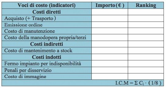 Definite e quantificate le voci di costo presentate in Tabella 2, è possibile determinare la criticità economica complessiva denominata I.C.M e definita come il valore medio dei valori numerici di ranking delle singole voci di costo. Tale valore di ranking risulta essere proporzionale all'entità dei costi e compreso nell'intervallo 1÷10. Il valore 1 sarà assegnato all'indicatore che presenta il minor costo mentre il valore 10 sarà assegnato all'indicatore che presenta il costo più elevato.
