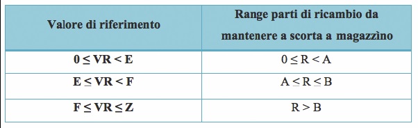 In base ai valori precedentemente individuati, è possibile associare in maniera proporzionale dei valori numerici compresi tra 1 e 5 ai fattori sopra indicati, fornendo una prima stima qualitativa dei livelli di scorta delle parti di ricambio, selezionando un range di riferimento (tabella 3).